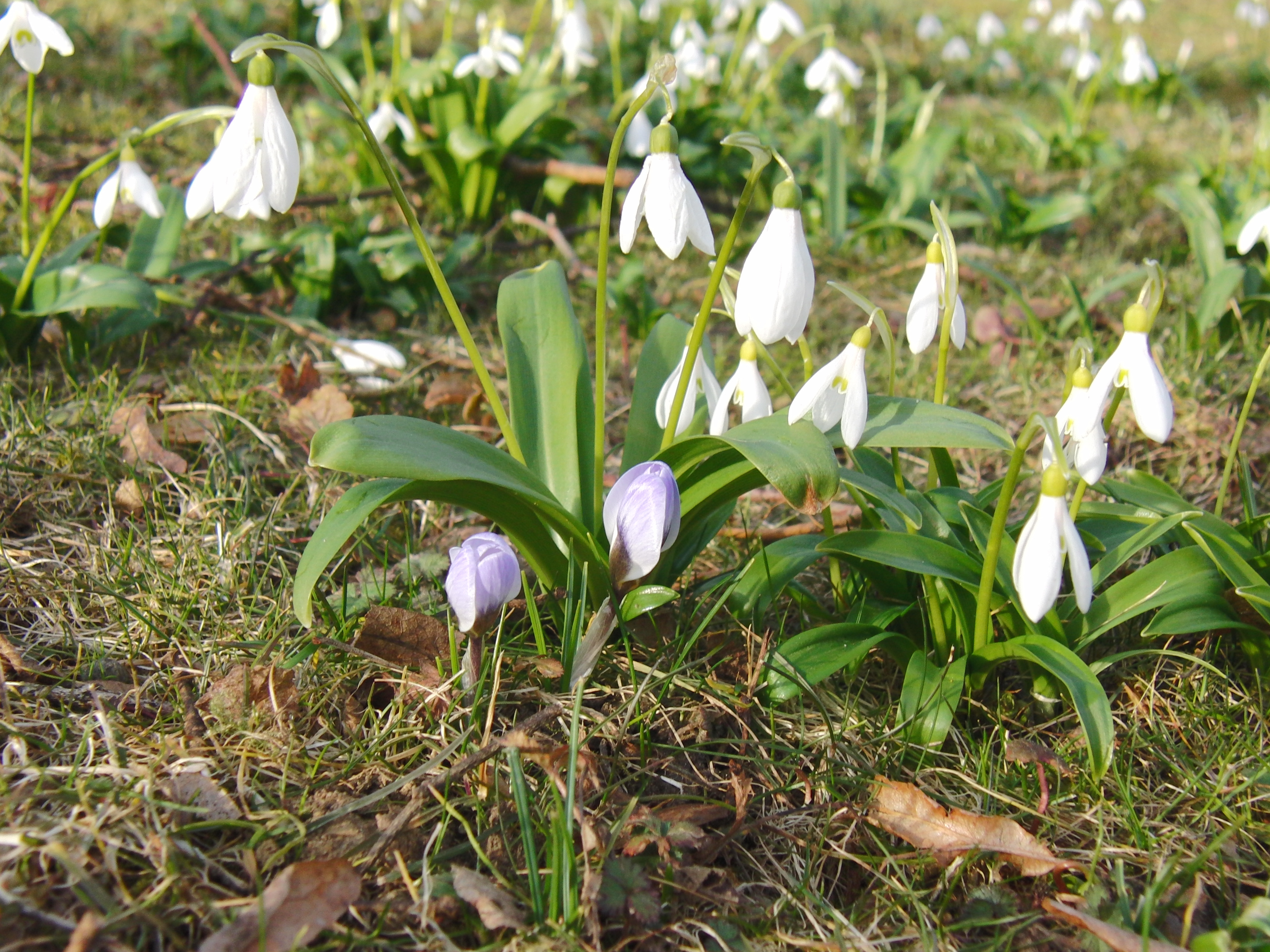 Zwei Krokusse bei den Schneeglöckchen
