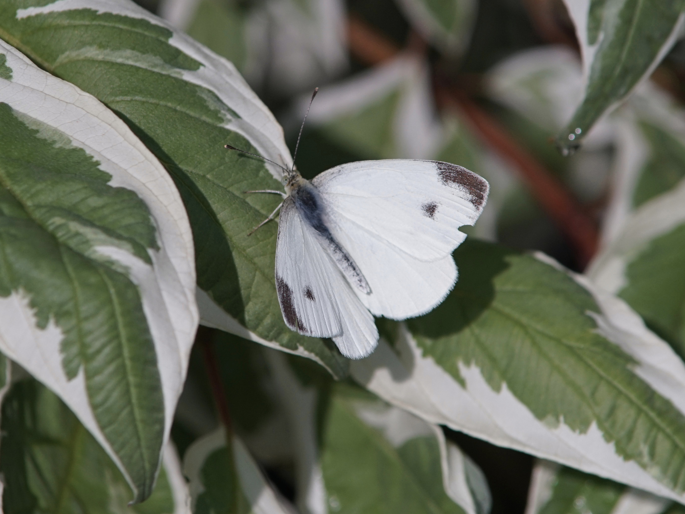 Kohlweißling auf grün-weißen Blättern