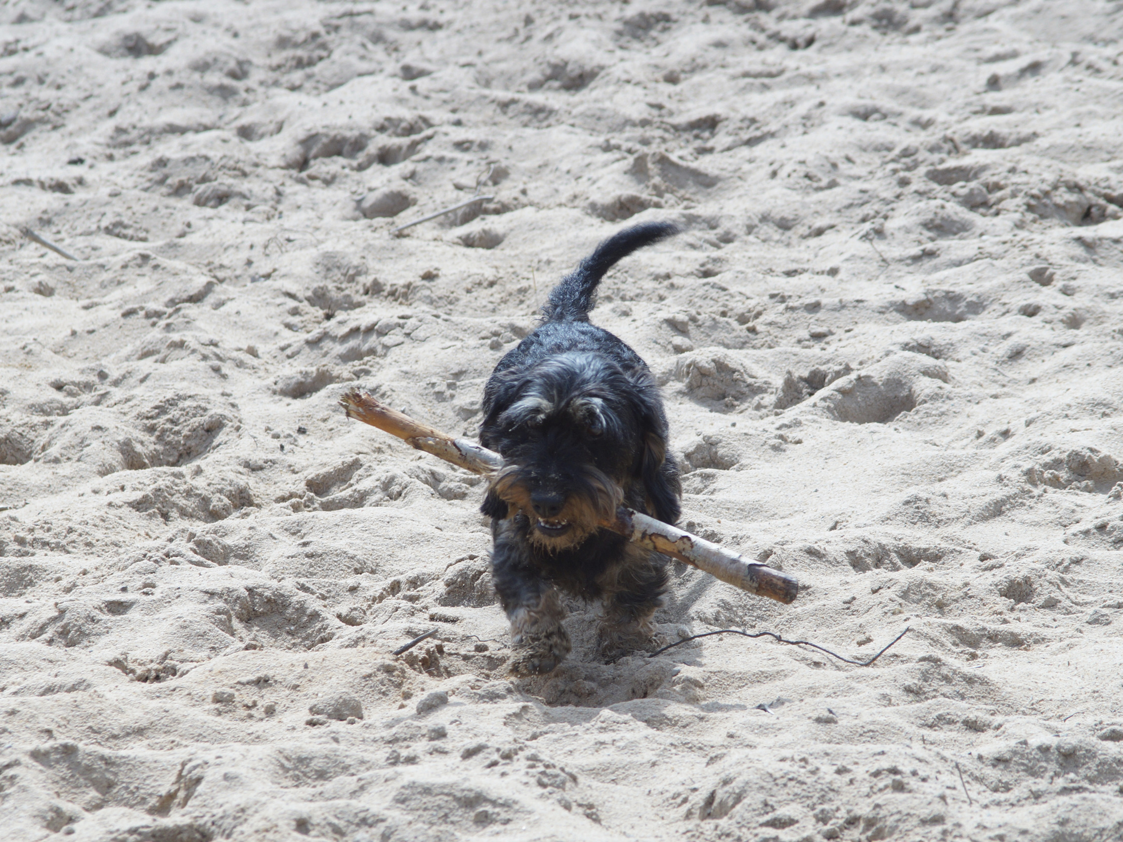 Dackel mit Stöckchen im Sand